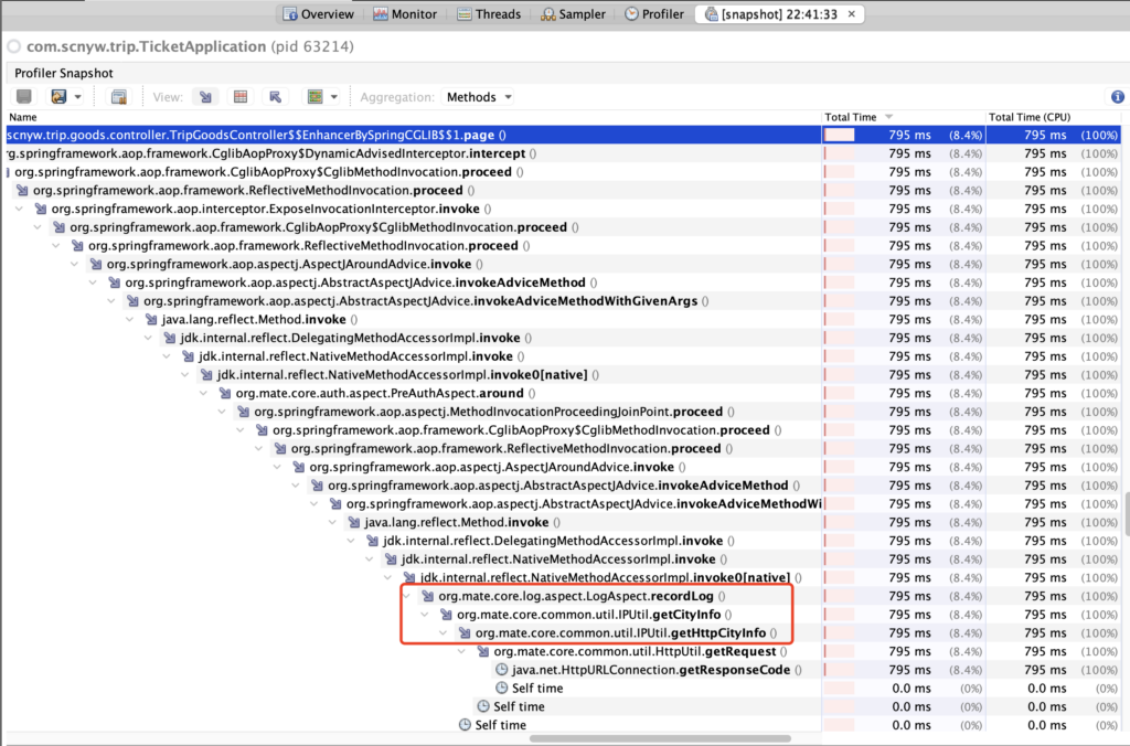 最近测试接口的时候发现一个业务执行时间100ms左右的接口,返回时间竟然需要700-1800ms,有点太离谱了用VisualVM看看函数调用链情况。